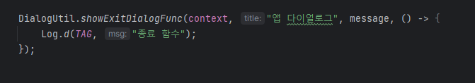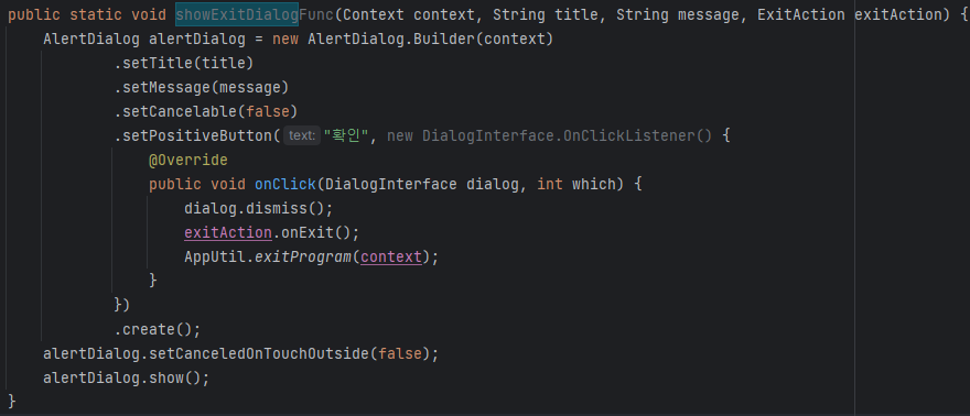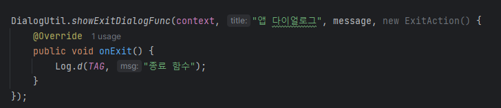 이런식으로 인터페이스를 하나 선언하고(해당 인터페이스는 다이얼로그가 종료될때 실행될 함수를 전달하기위해 만들었다)