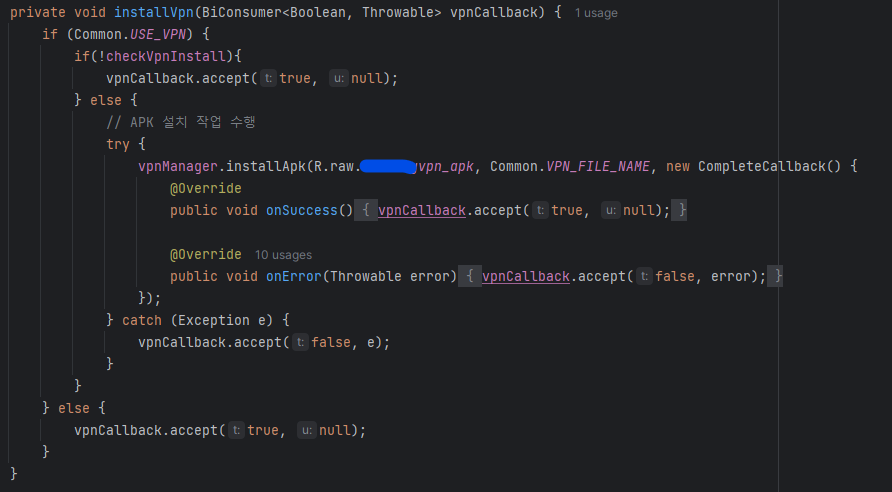 vpnManager.installApk(R.raw.****vpn_apk, Common.VPN_FILE_NAME, new CompleteCallback() {