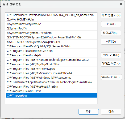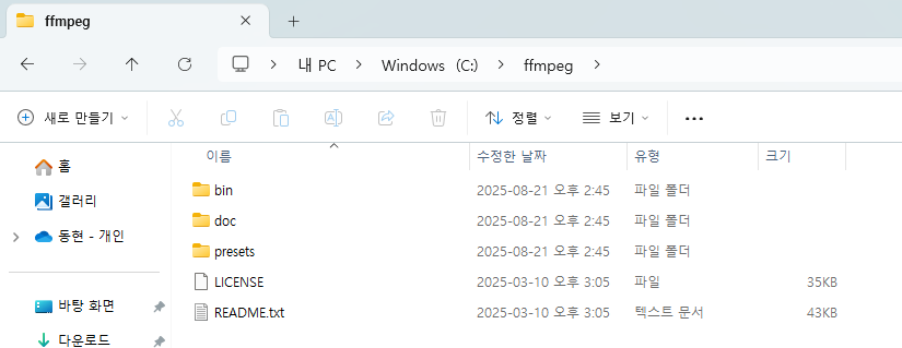 (나는 C드라이브로 폴더명을 ffmpeg로 변경 시킨 뒤 이동시켰다)