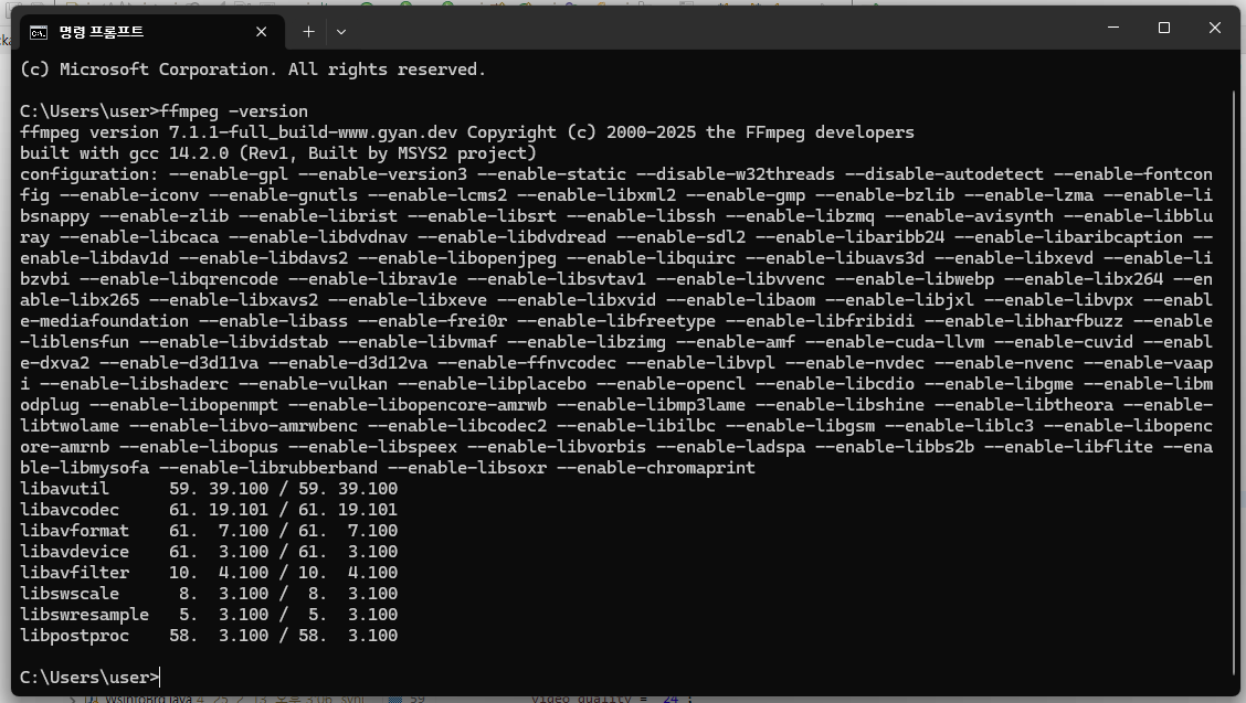 ffmpeg -version 으로 설치 확인